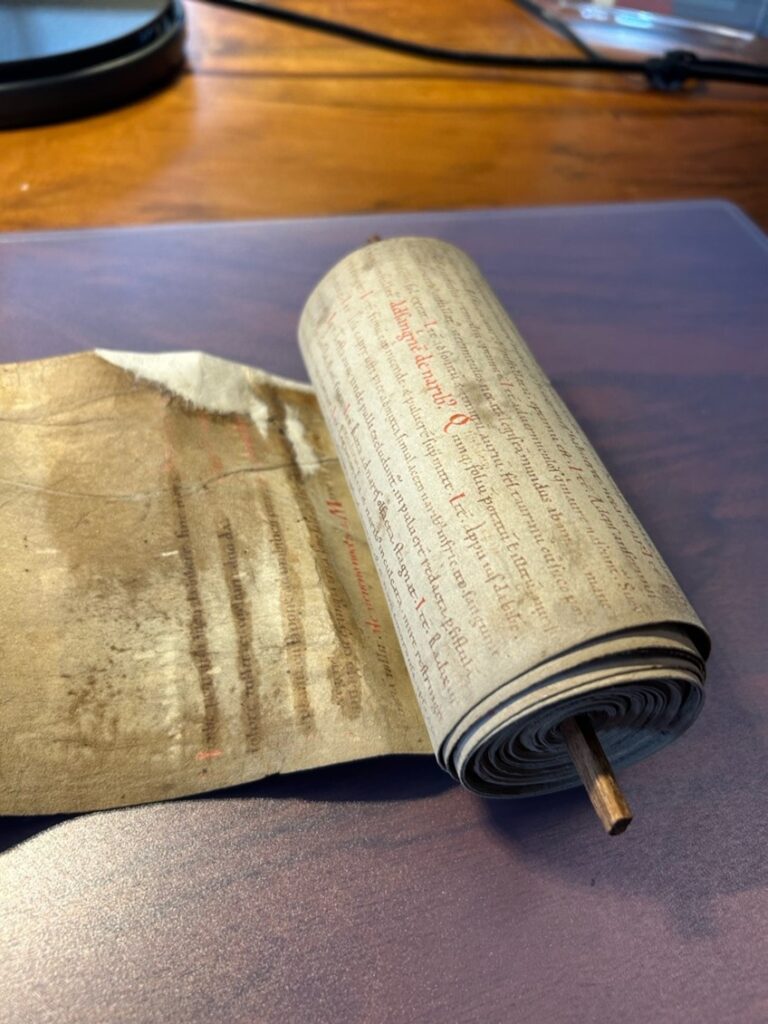 Filling the gaps in the transcription was not the only way in which seeing the Rotulus in person helped me to understand it better. Scholars have long questioned why the Rotulus was produced as a scroll rather than as a codex. For instance, Lucille Pinto proposed that someone might have hung the entire manuscript on the walls of an infirmary, whereas Walter Henzen suggested that it may have had something to do with “magic”.[6] Working with the Rotulus in person helped me to think more about how someone could have used it. To my surprise, the Rotulus was much sturdier, much more compact and much more navigable than I expected. After working with the scroll online for a few years, it was not difficult to find the entries that I wanted to see. By rolling down the bottom while rolling up the top of the scroll in the same pace, it was never necessary to unfold the entire six meters. It was relatively easy to find the clusters of remedies for specific conditions and lay those out on the table. With that in mind, it does not seem entirely impossible that the Rotulus was a handy and portable manuscript, perhaps a text consulted by a medical practitioner to help people with their haemorrhoids, adulterous spouses or superfluous humours.