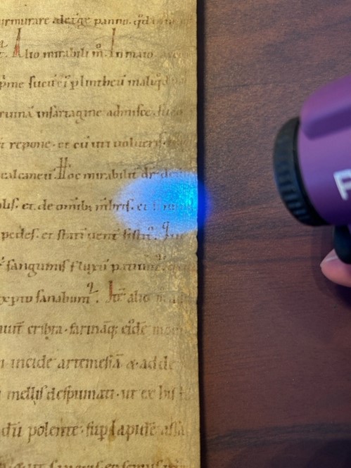 Although there is an excellent digital facsimile available online (see n. 1), it was essential to consult the Rotulus in-person to try to decipher some of the barely legible parts of the scroll. On both sides of the manuscript, parts of the text are faded or cut away. Luckily, several near contemporary manuscripts with parallel sections of recipes have been identified in the process of producing the new edition and translation, and this has meant that we were able to suggest possible readings for many of these gaps. For some other recipes, however, we simply could not find such similar textual witnesses, and, regardless, for those that we did, the manuscript still needed to be checked. Armed with a UV-light from the Burgerbibliothek, my task was to try to fill the remaining gaps in our transcription.